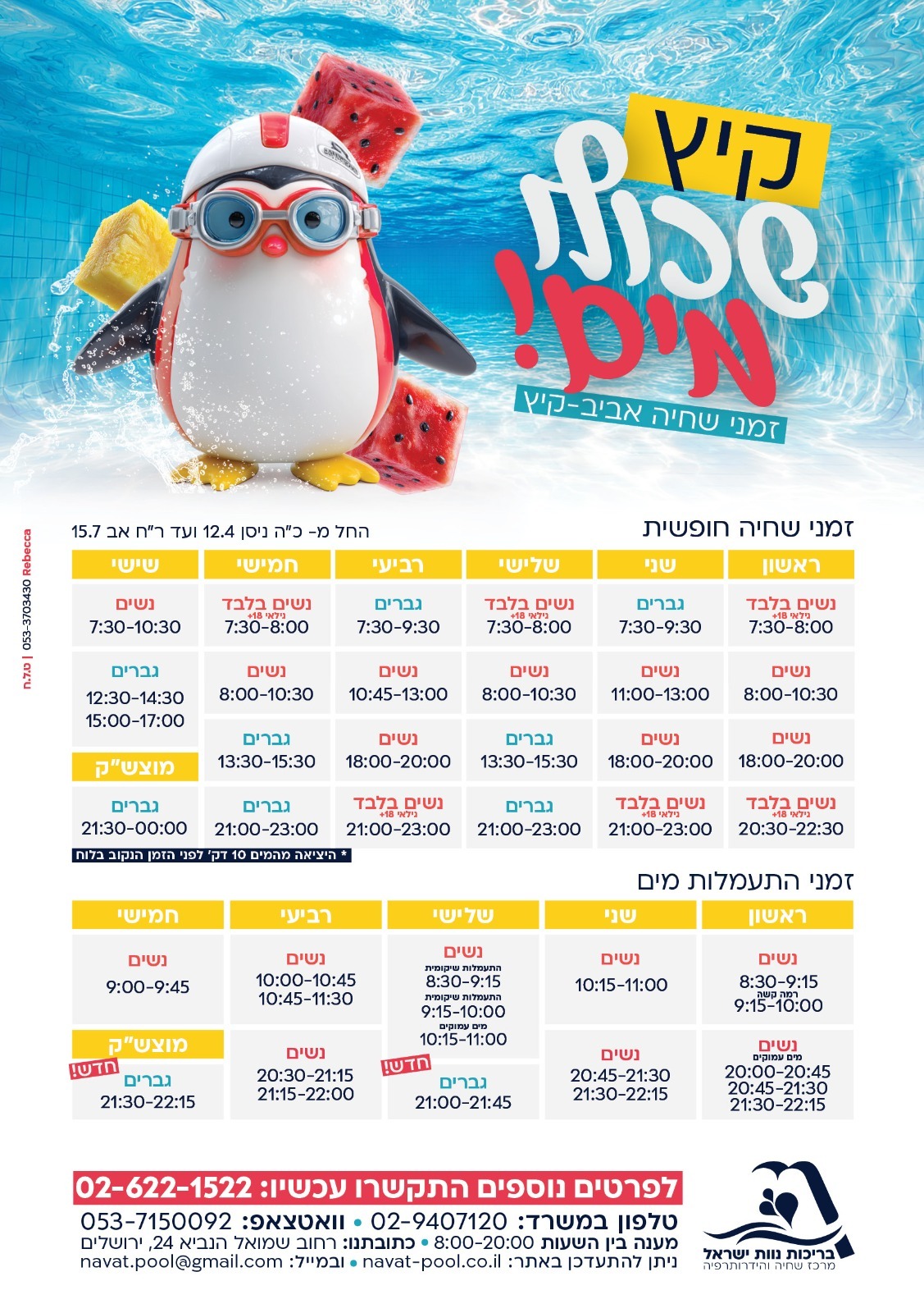 עקב המלחמה שנכפתה בימים אלו על ארץ הקודש זמני הבריכה משתנים באופן תכוף. מומלץ להתקשר בטרם ההגעה למענה הקולי ולהתעדכן בטרם ההגעה.